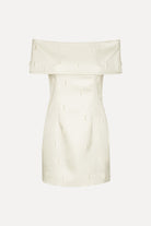 THE BEADED SATIN MINI DRESS IS CUT FROM SMOOTH SATIN AND EMBELLISHED WITH TONAL BEADING. IT FEATURES SLIM STRAPS, A SCULPTED BUST, AND A FITTED SHAPE THAT FLARES GENTLY TO A MINI HEM.