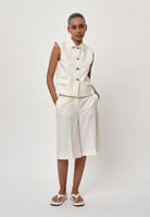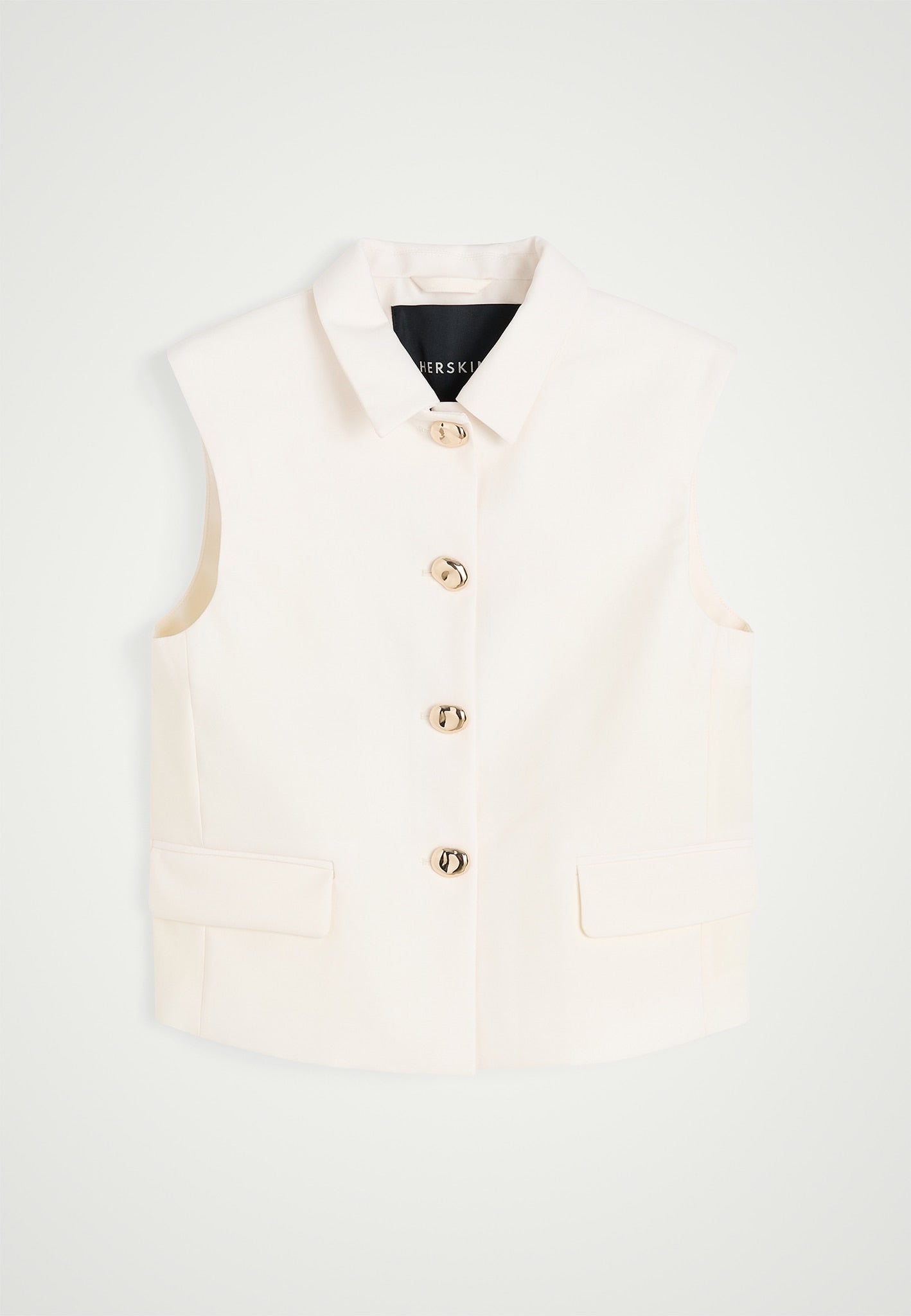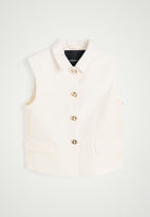 Introducing the Brian Vest with Gold Buttons: A sleeveless vest featuring two paspel pockets and a gold button closure at the front with a cropped fit.