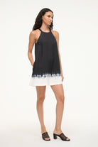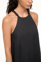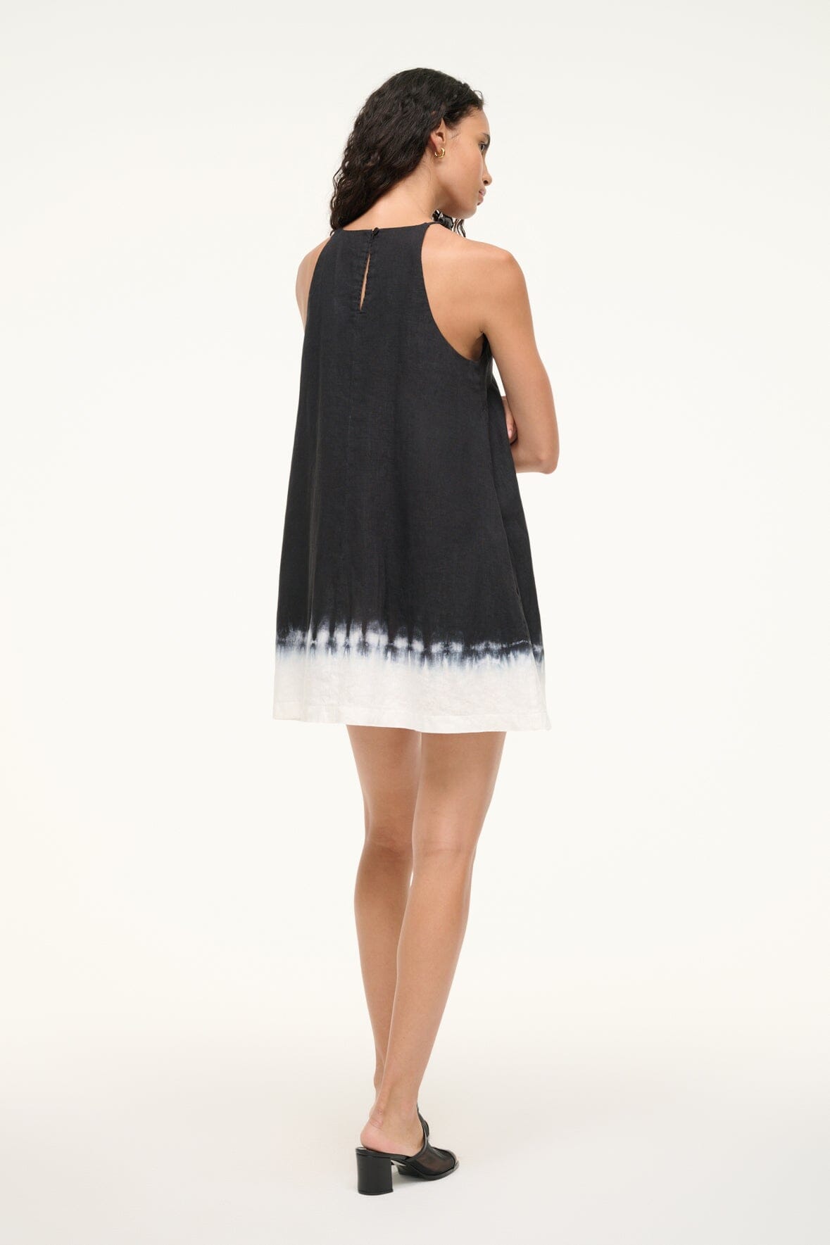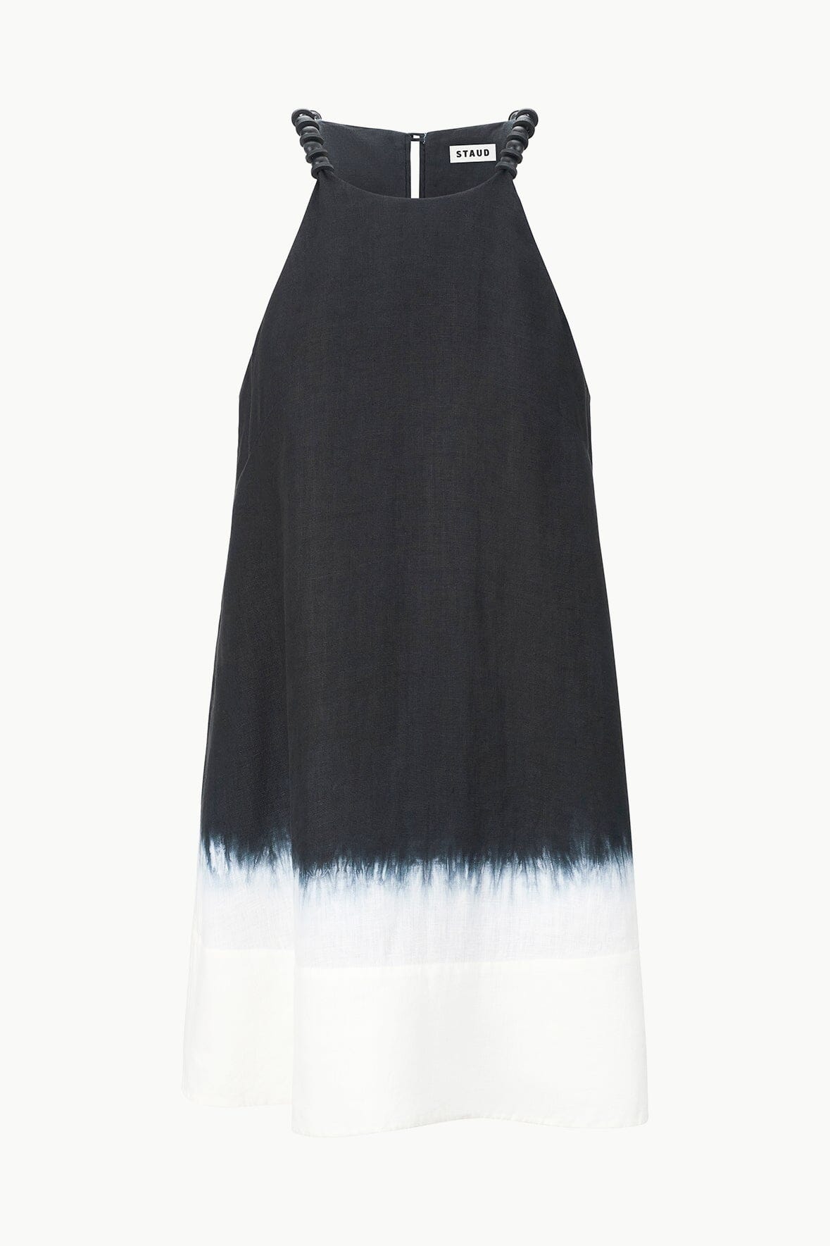This is a mini length dress with beaded halter straps and an a-line silhouette. The Cabo features a button closure at the back neck and a dip-dyed hem.