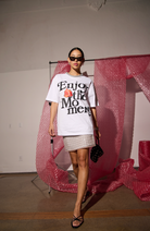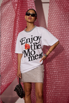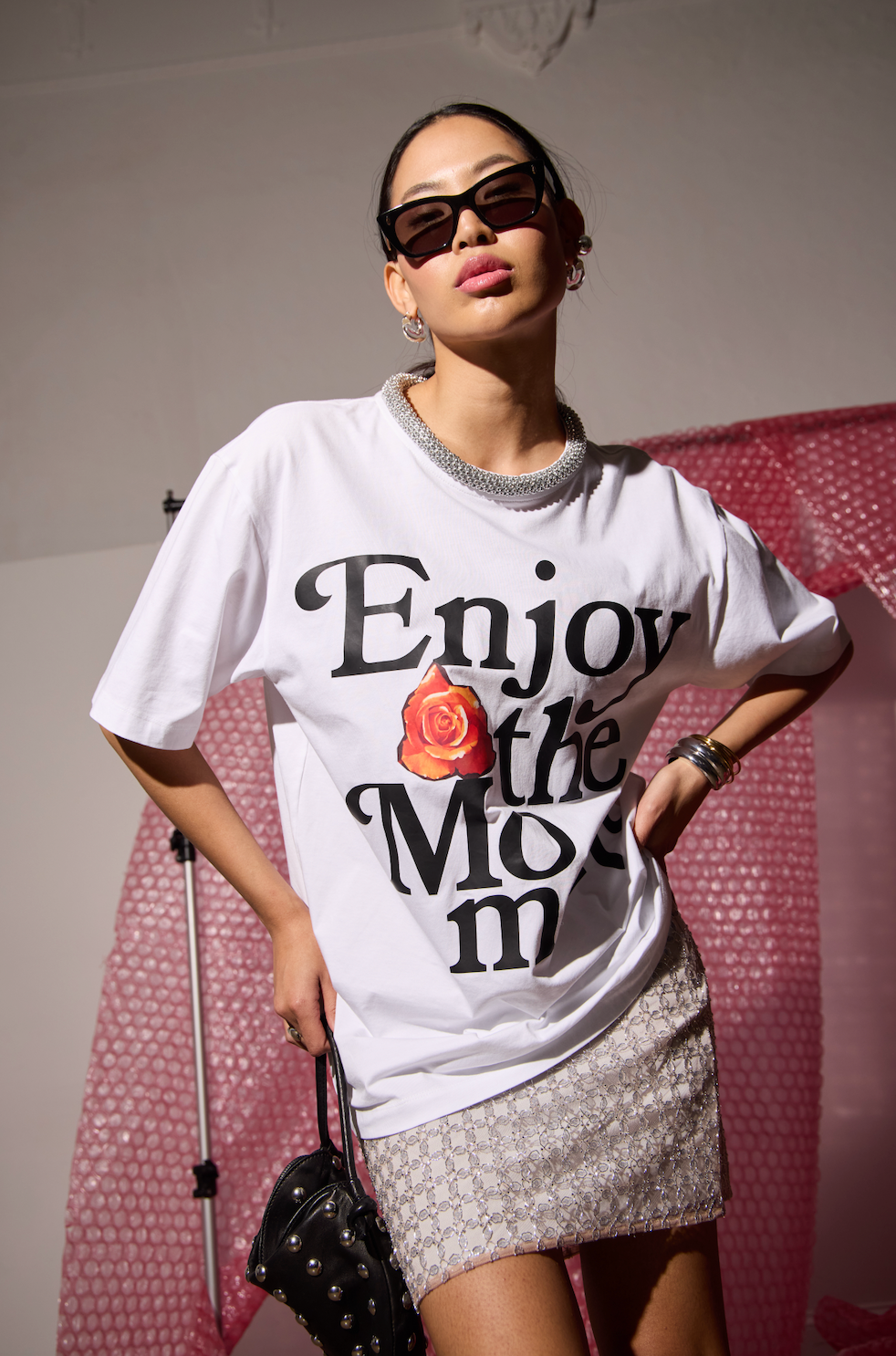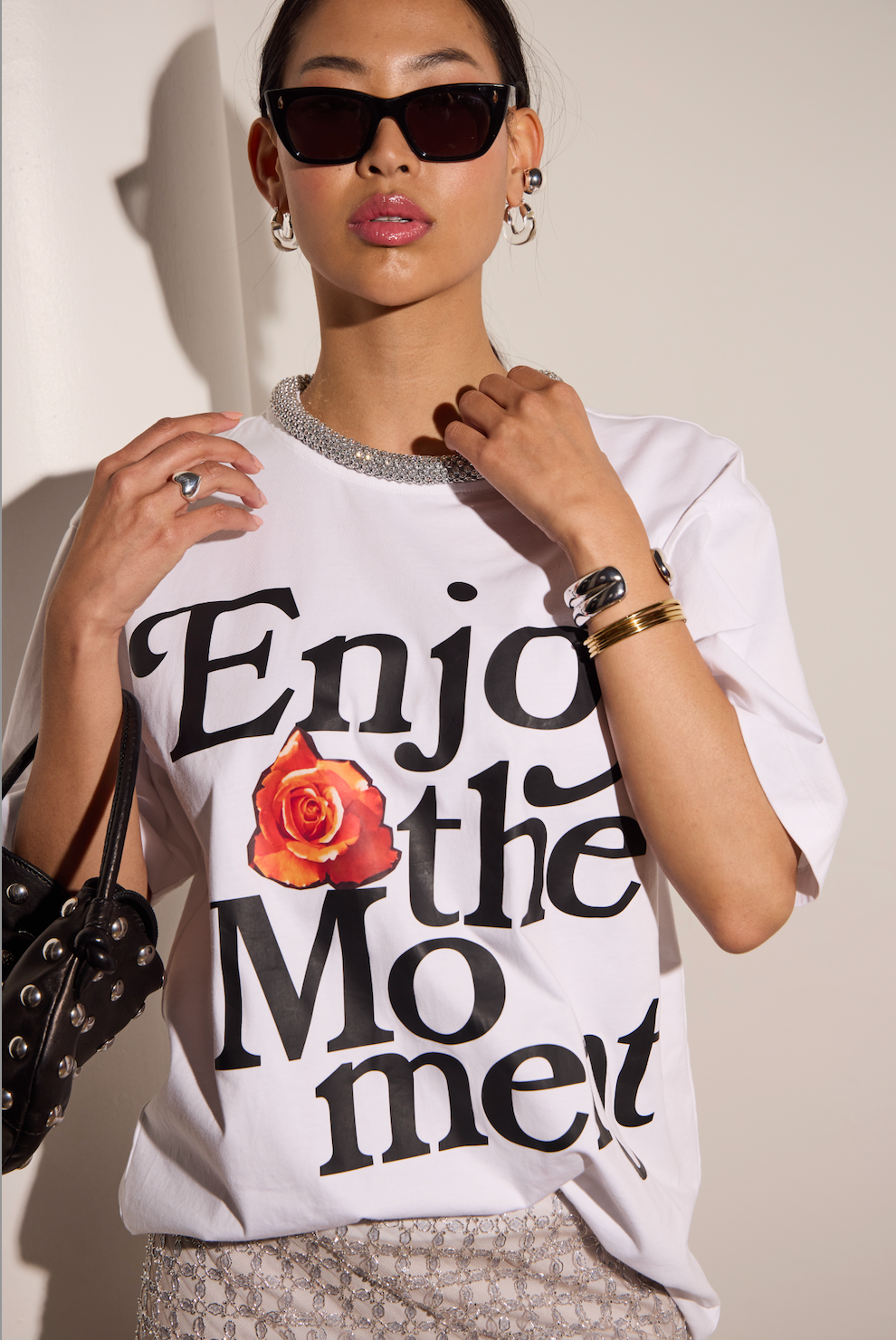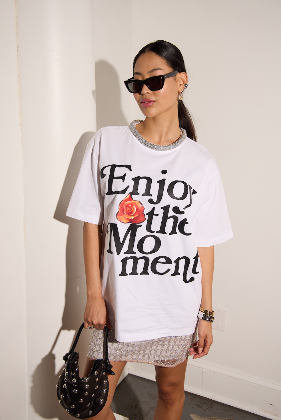 Our Spring 2025 collection is an ode to joy, and this oversized tee invites you to pause and revel in the beauty around you. Crafted from soft cotton, it features a bold graphic design as a reminder to live every moment to its fullest. The look is elevated with an embellished crystal neckline, adding a touch of effortless glamour.