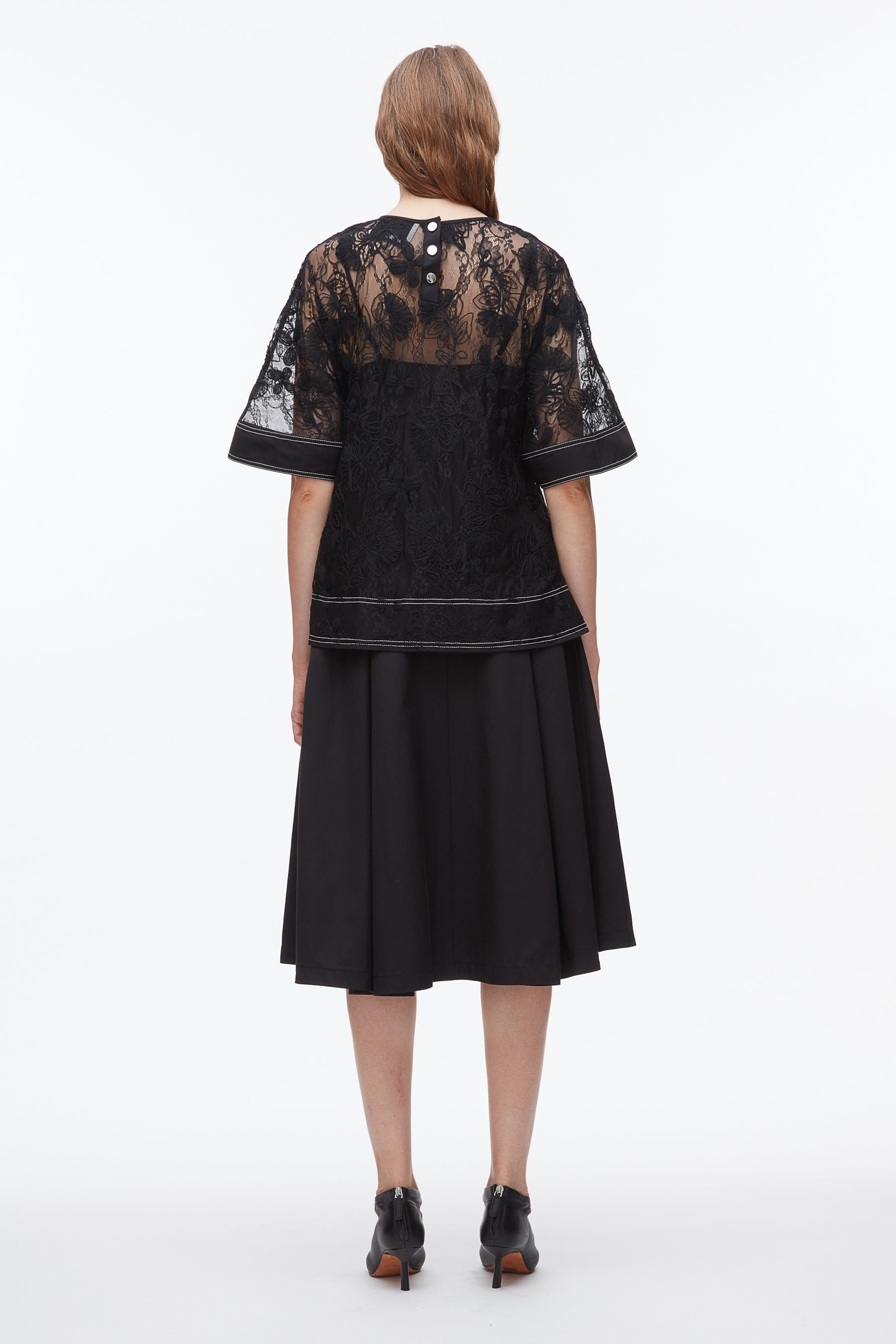 Always the romantic, but never the wallflower. This sleeveless top pairs delicate floral lace with cotton twill trim and metal snap detailing—feminine and edgy in equal measure. The fitted shape is punctuated by a peplum hem, adding structure and movement with just the right touch of attitude. Pair it with the matching skirt for a striking take on event dressing.