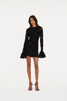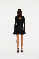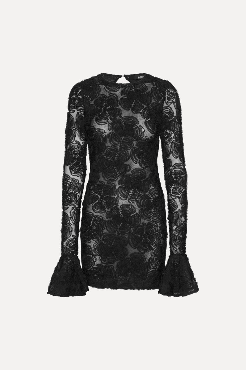 The Flower Mesh mini dress features a sheer mesh design that is fully lined with textured floral embroidery throughout. The long sleeves flare at the cuffs, while the mini-length silhouette includes a daring open back.
