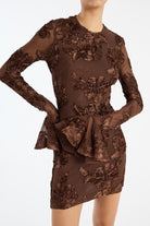 FLOWER MESH MINI DRESS DARK BROWN IS A FITTED MINI DRESS WITH LONG SLEEVES AND FLARED CUFFS. IT IS CRAFTED FROM A SHEER MESH BASE WITH RAISED FLORAL EMBROIDERY THROUGHOUT. THE DRESS FEATURES A ROUND NECKLINE AND A SHORT HEMLINE. IT IS LINED.