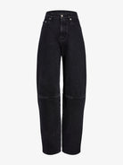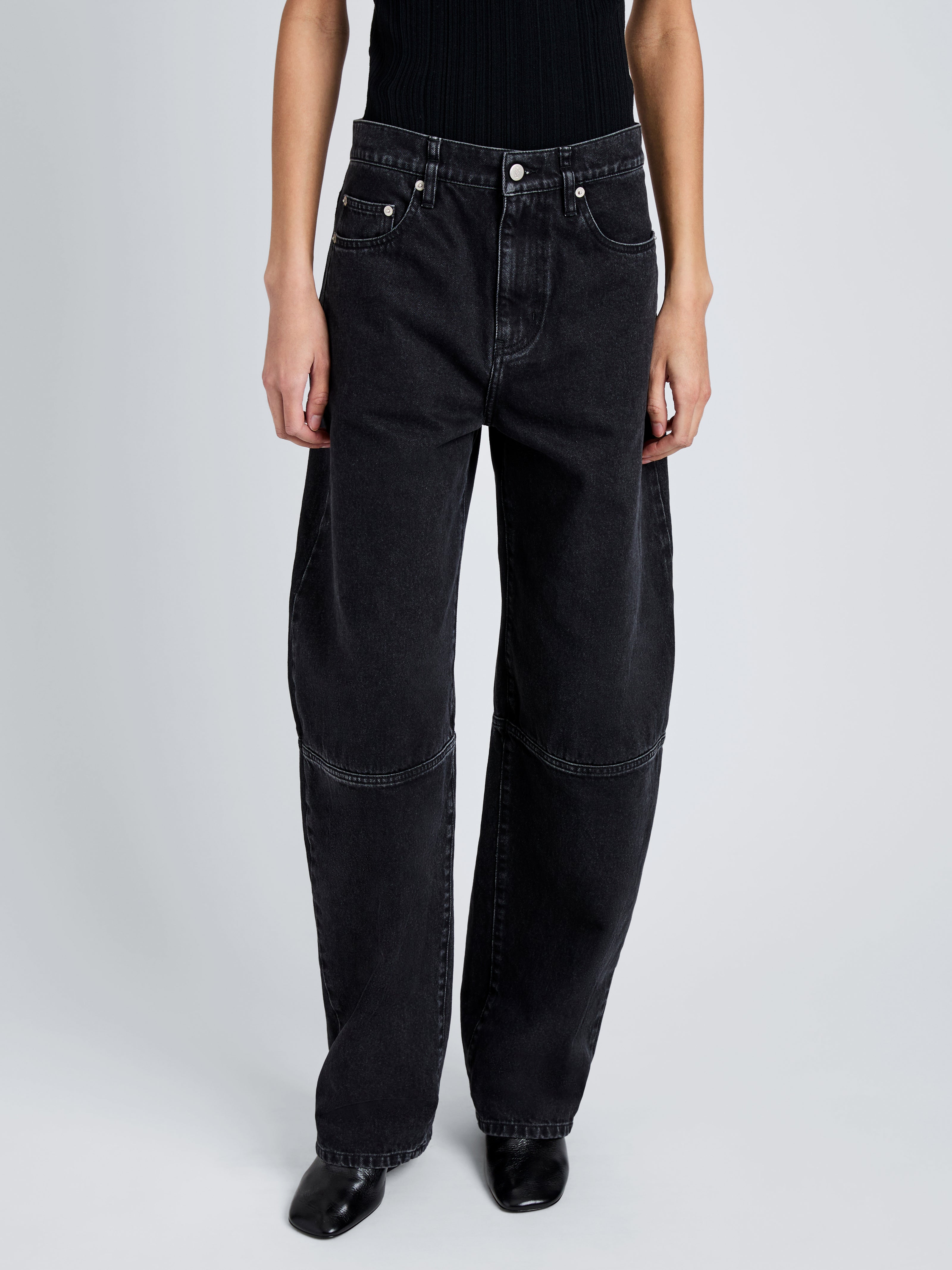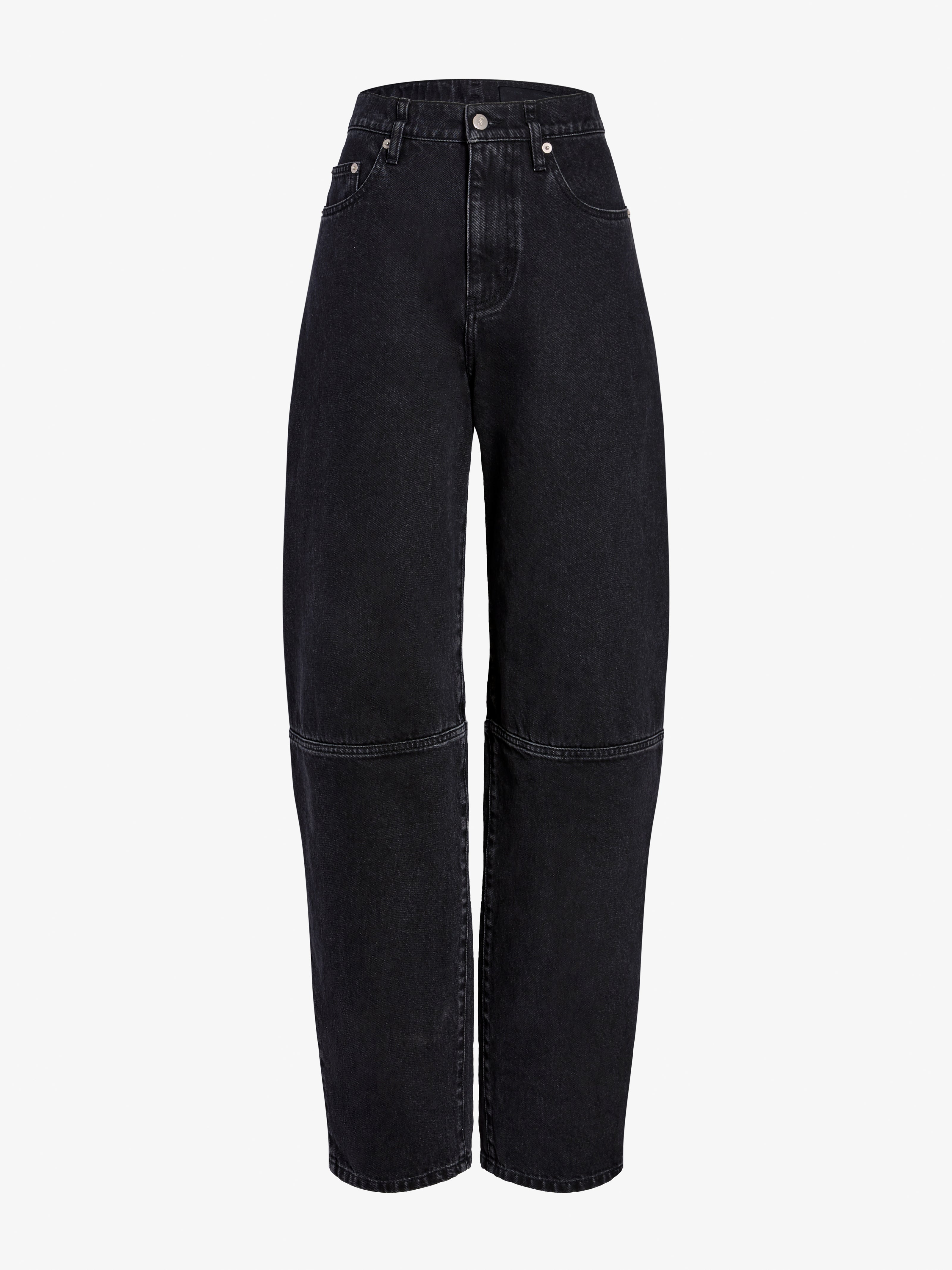 The Fontana Jean in Black Rigid Denim is high rise - designed with a sculpted barrel leg and a defined knee seam to create a modern, structured silhouette. Finished with a classic zip fly and subtle fading throughout.