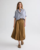 Voluminous midi skirt in water-repellent twill. Fabric is a durable cotton–nylon gabardine that is stain-proof and water-repellent. The Full Intentions Skirt is designed with a sculptural A-line shape that collapses into a softly bubbled hem. Fitted at the waist with subtle front seaming for structure. Finished with side pockets and a concealed zip closure.