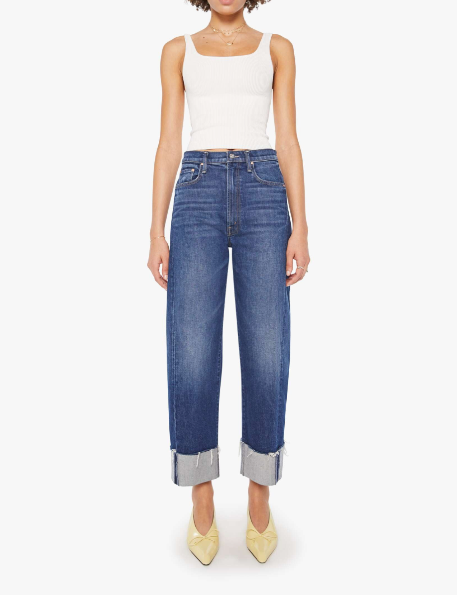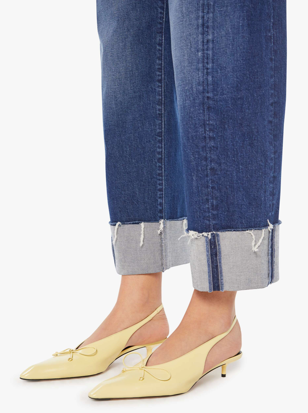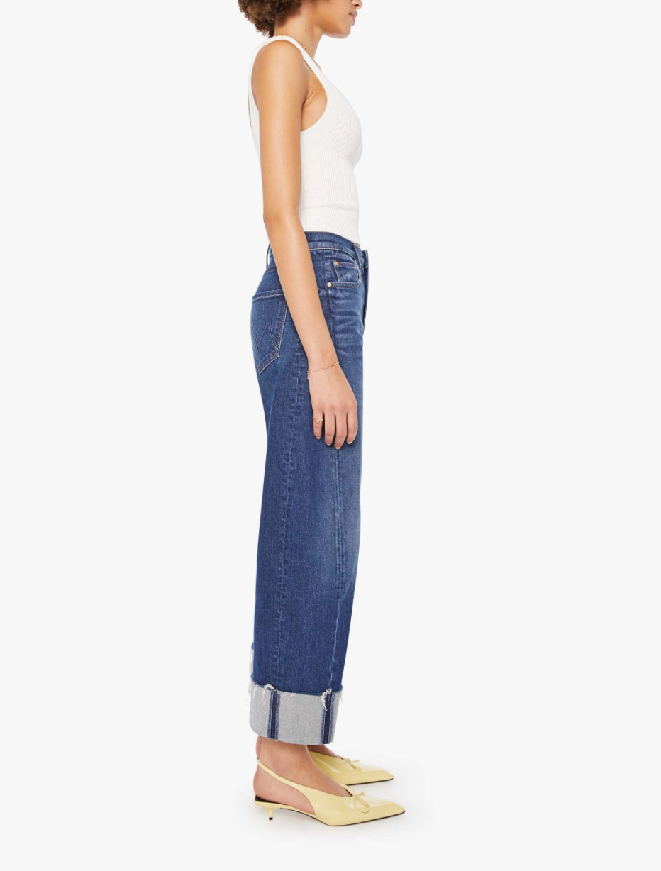 A super high-waisted barrel jean with a zip fly, wide, curved leg and an ankle-length inseam with a cuffed, frayed hem. Made from semi-rigid SUPERIOR denim, Perfectly Imperfect is a dark blue with whiskering and fading at the knees.