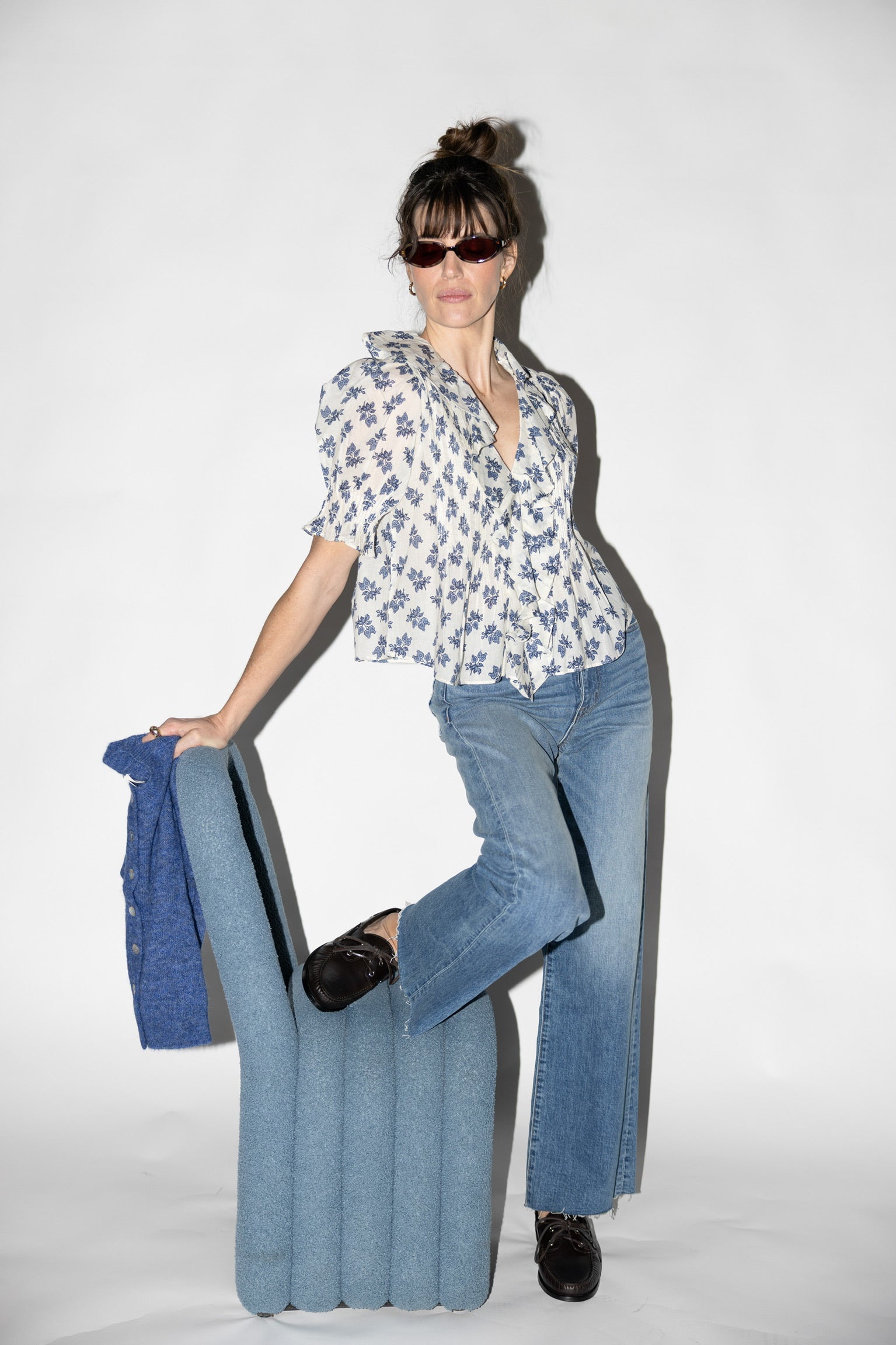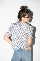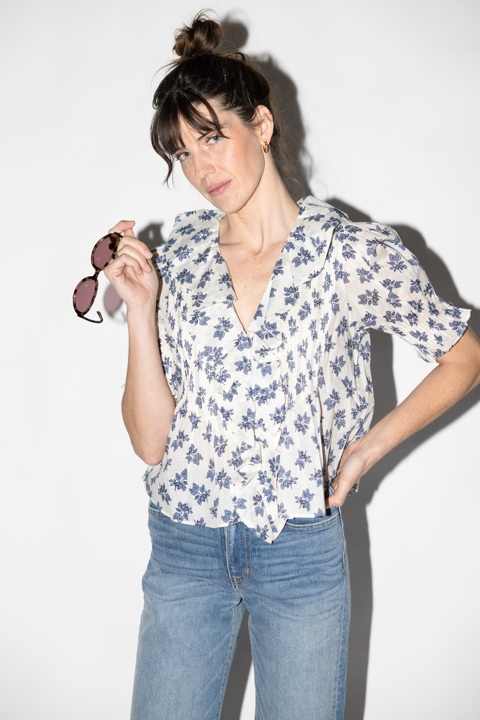 Crafted of cotton, this Henri striped top from DÔEN is styled with a V-neck, short puff sleeves, and delicate ruffles.