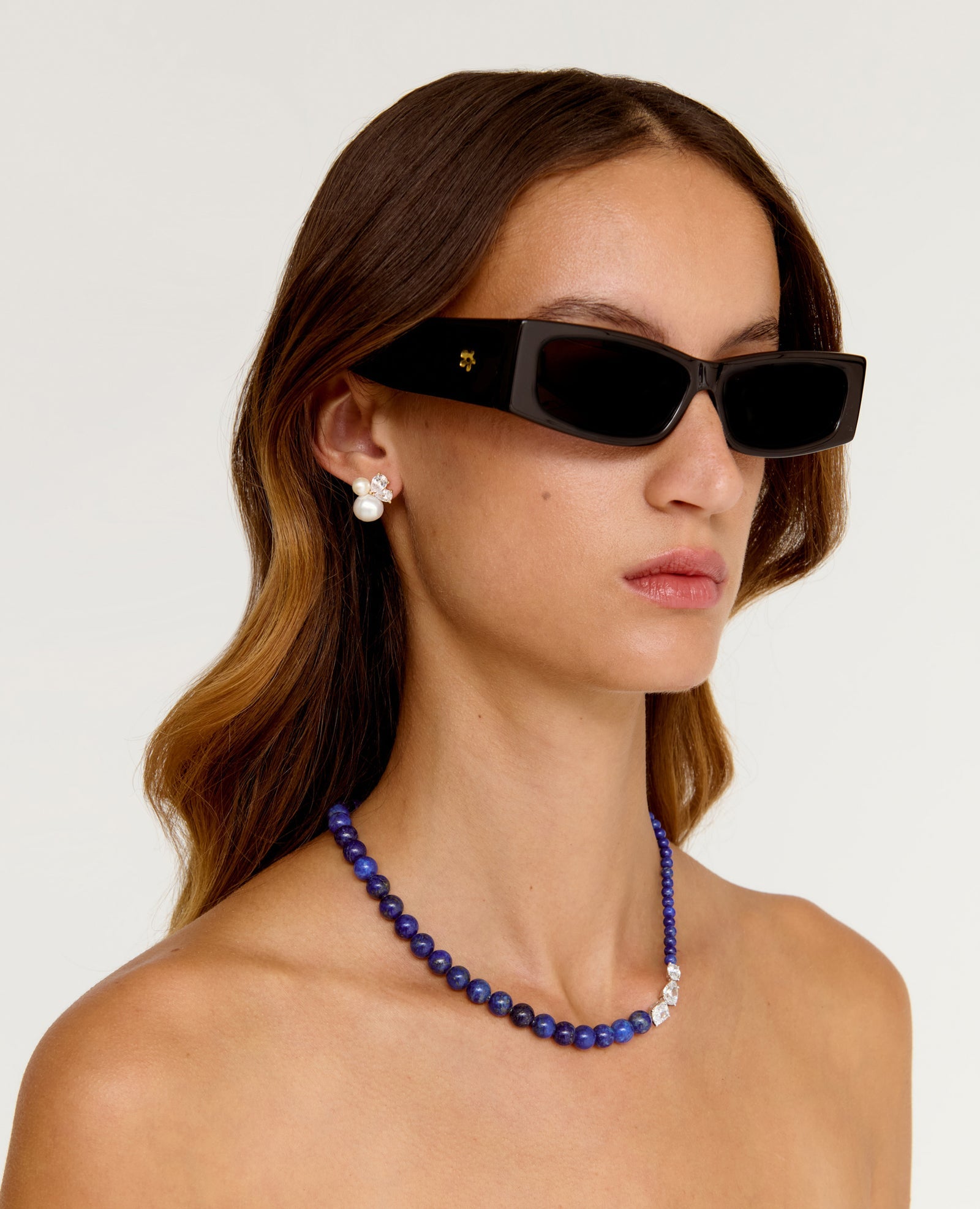 Our Lazuli necklace plays with balance and texture, combining graduated deep blue lapis lazuli beads with a trio of oversized cubic zirconia stones and silver plated hardware. Strikingly asymmetrical and intentionally offbeat, it’s a conversation starter that is perfect for layering or on its own.
