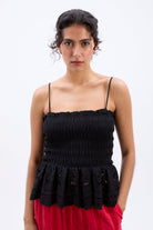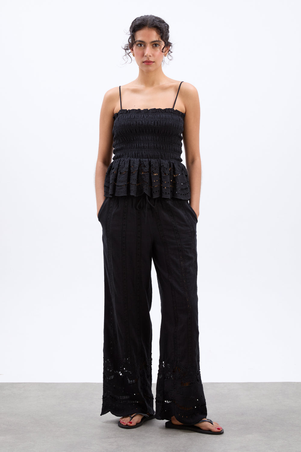 An elevated staple, the Martina Cami in black is designed with a shirred bodice for a flattering fit. Featuring removable straps, a delicate broderie cut-out hem, and an open back with tie detailing, this organic cotton blend piece is both versatile and timeless. Pair with the matching Martina Trousers to complete the look.