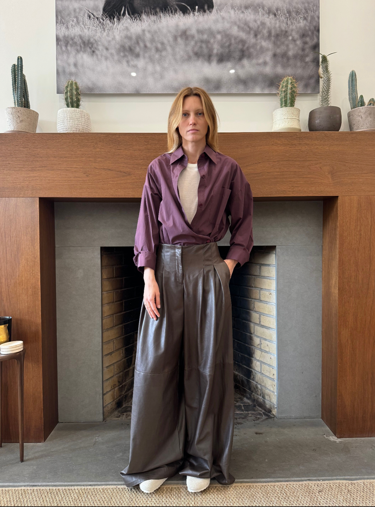 Oversized button down shirt in cotton poplin. This fabric is a smooth, more structured poplin, in a plain weave, developed for effortless wear. The Earl is a relaxed shirt featuring an asymmetric button front. Complete with a spread collar, chest patch pocket, back yoke, box pleat at the back, and single roll button cuffs.