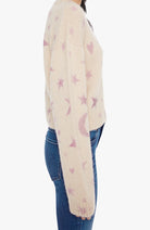 Starstruck. A crewneck sweater with drop shoulders, thick ribbed hems and a slightly cropped fit. Made from a blend of baby alpaca and merino wool, the Crop Jumper in Seeing Stars is designed in cream with a light pink celestial print airbrushed throughout.